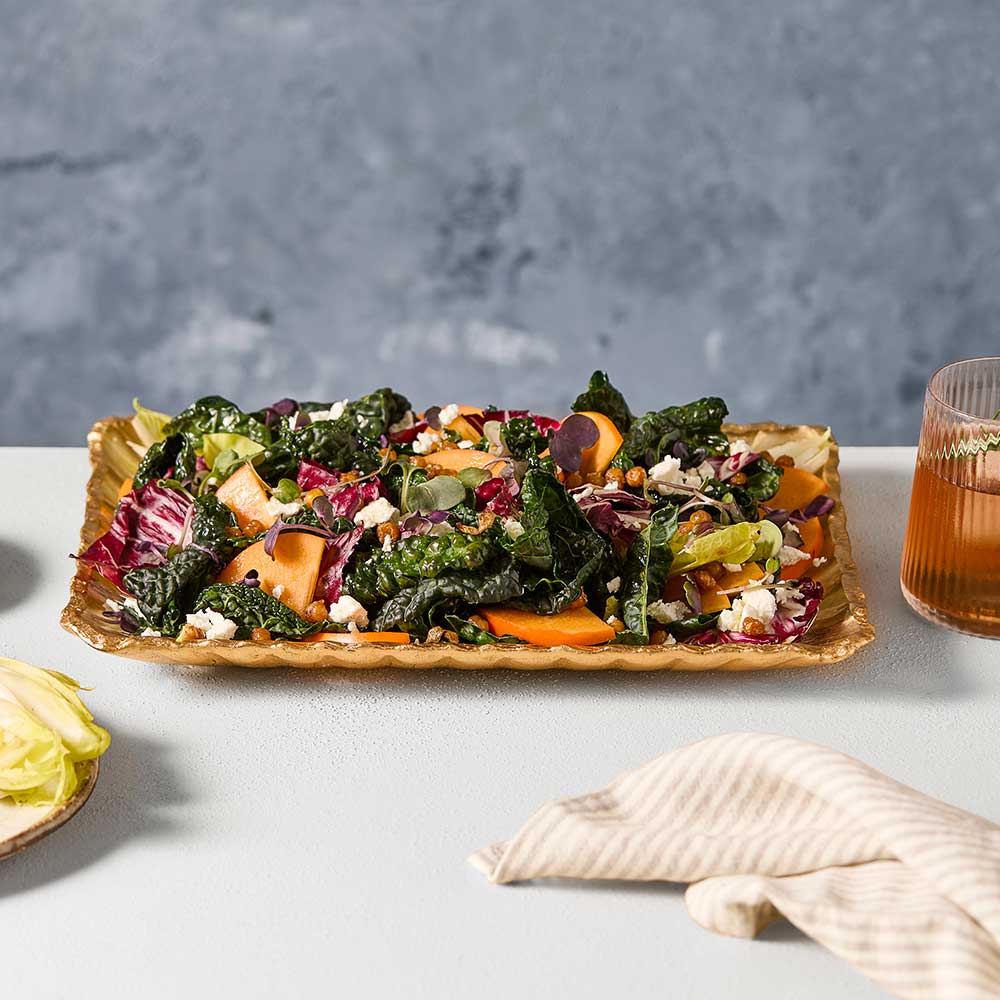 Serve your next charcuterie board with a touch of opulence using the Alex Liddy® Pave Gold Rim Rectangular Tray.