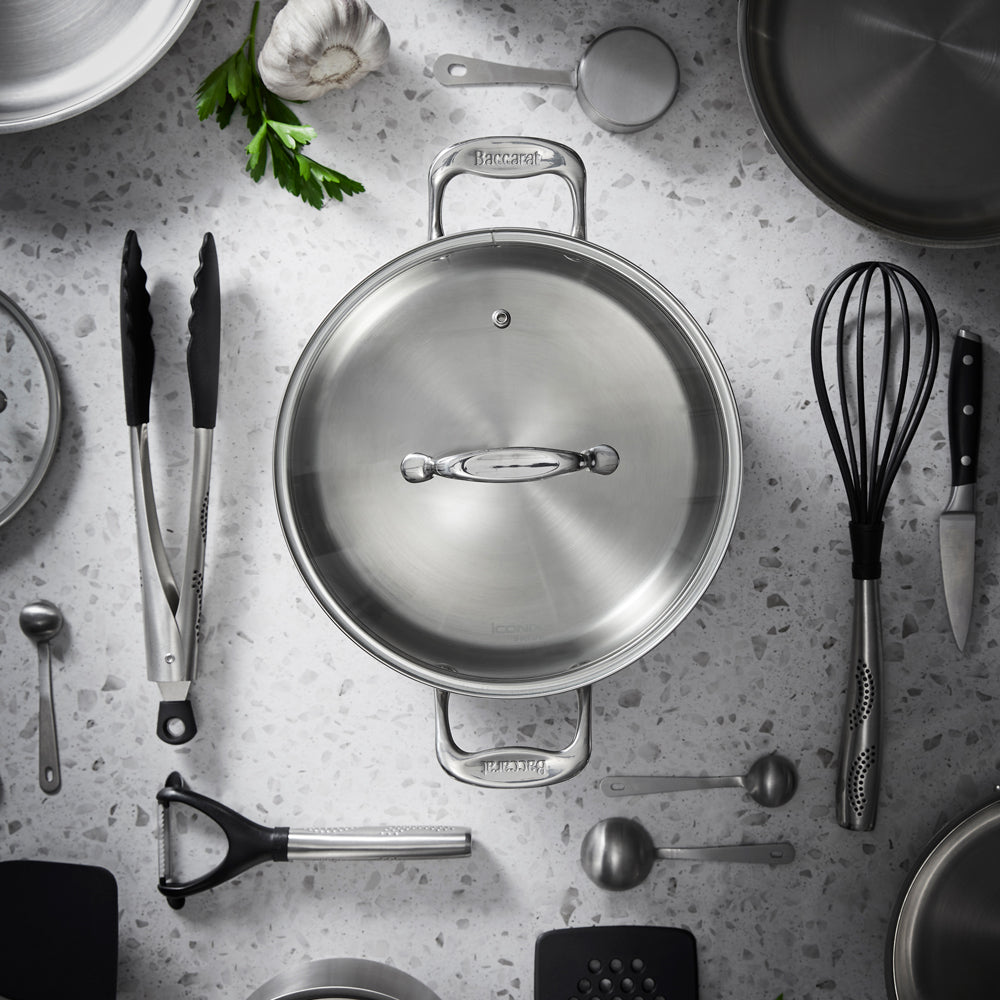 Enhance your kitchen with superior quality cookware using the Baccarat® iconiX® 24cm Casserole with Lid. Made from the highest grade 18/10 stainless steel and with a durable 5mm impact bonded base that works to distribute heat evenly, the Baccarat® iconiX® casserole is a must-have cookware piece for any kitchen. With an easy clean mirror finish interior, stay cool cast stainless steel riveted handles, and an easy-view tempered glass lid, the Baccarat® iconiX® 24cm/4.8L casserole will make cooking like a professional part of your everyday life. Suitable for all cooktops including induction, the Baccarat® iconiX® range is also oven safe and dishwasher friendly up to 220°C - excluding lids - for your convenience.