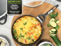 The generously sized ergonomic Never Hot heat resist Bakelite handle is riveted to the cookware for superior strength, safety and durability. Designed to resist heat transfer and will stay cool for longer when on cooktops.