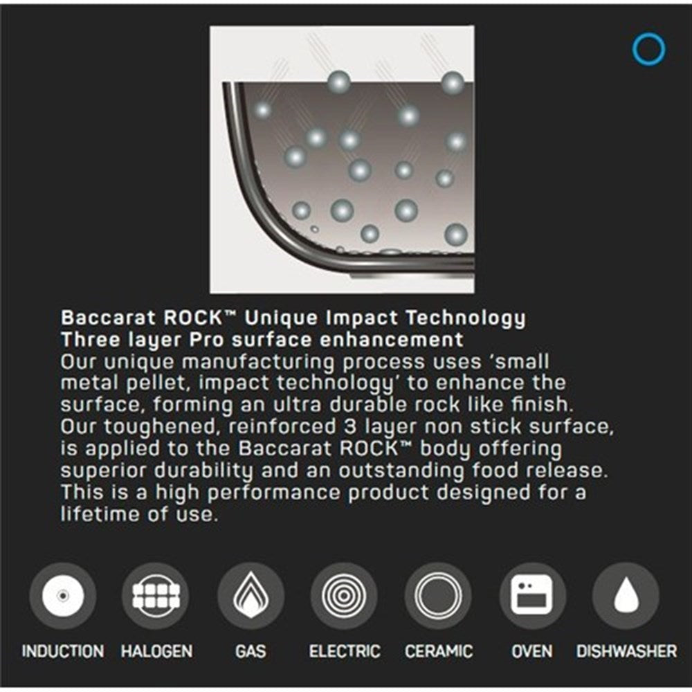 Everyone could do with a good saute pan in their cookware collection. The Baccarat® Rock Saute Pan with Lid 28cm is a great choice since it offers the professional cooking experience and durability that every home chef desires. Made with a unique process called small pellet impact technology to enhance the durability, resulting in a surface that is as hard as (you guessed it) rock! How does this non-stick pan compare to others? On standard abrasion tests it reaches 700,000 cycles and still stops food from sticking. This is compared to the most reinforced non-sticks that reach 400,000 and the best conventional non-sticks that reach 20,000 cycles. The Baccarat® Rock Saute Pan features a heavy gauged forged body for quick and even heat distribution plus it has high sloped sides for more surface area for cooking. The heavy base also ensures that the saute pan will be warp-free for a lifetime of cooking pleasure. Suitable for all cooktops including induction, the Baccarat® Rock Saute Pan 28cm comes with a matching tempered glass lid. Both dishwasher and oven to 220C safe, it is a highly practical piece of cookware with enough space to cook for the whole family. Baccarat® is so confident with the Rock saute pan that they offer a lifetime guarantee when cared for according to the Care and Use instructions provided.