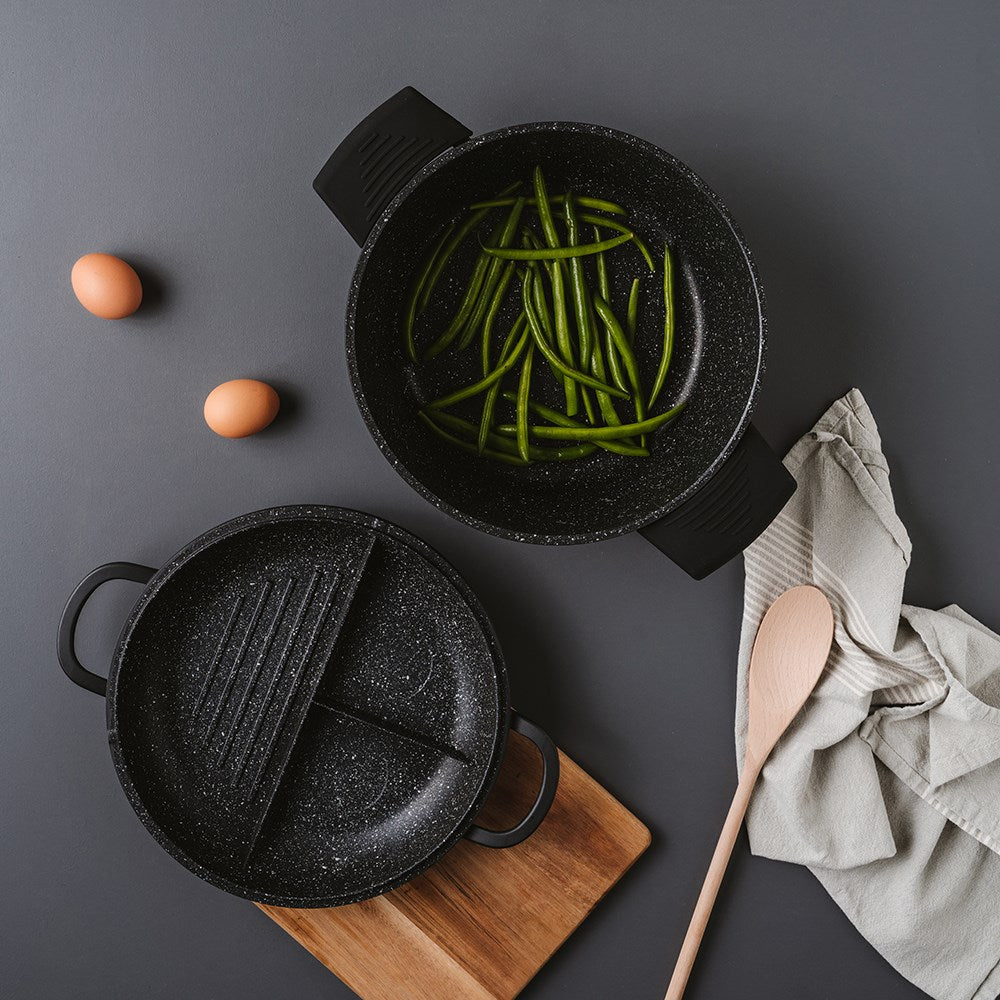 • 2-piece multi cooker set that enables you to fry, grill, and roast with ease