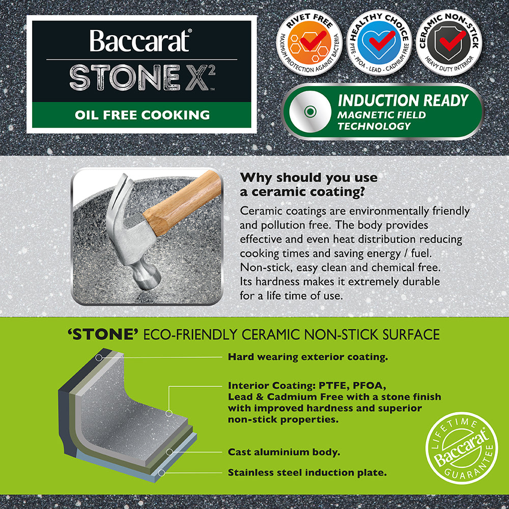 The 5-star reviews can’t be wrong. Our most loved cookware set is made clean, so you eat clean. Get the performance you deserve with ceramic non-stick technology without any harmful toxins. The Baccarat® STONEX2™ 6 Piece Ceramic Non-Stick Cookware Set is PTFE, PFOA, Lead and Cadmium free making it the healthiest way to cook. Cook up a storm with peace of mind; this cookware set conducts heat evenly and effectively due to its durable, sturdy body and ceramic coating that will last forever. Back by the Baccarat® Lifetime Guarantee, the Baccarat® STONEX2™ 6 Piece Ceramic Non-Stick Cookware Set delivers ground-breaking innovation making it suitable for all cooktops, including induction, and is dishwasher and oven safe, which means less work for you and more time to play with new recipes.