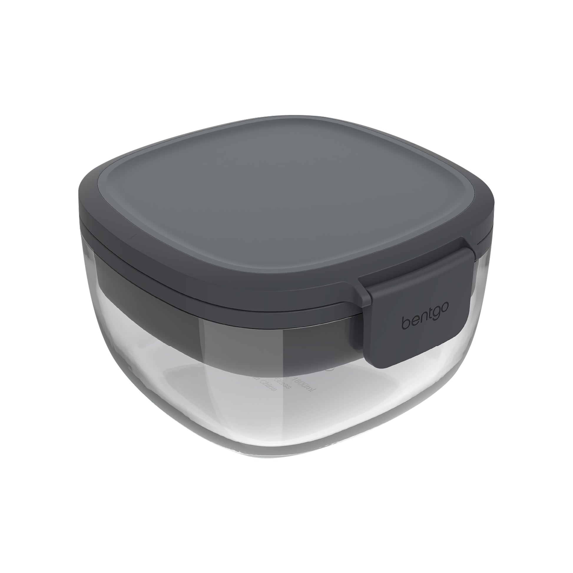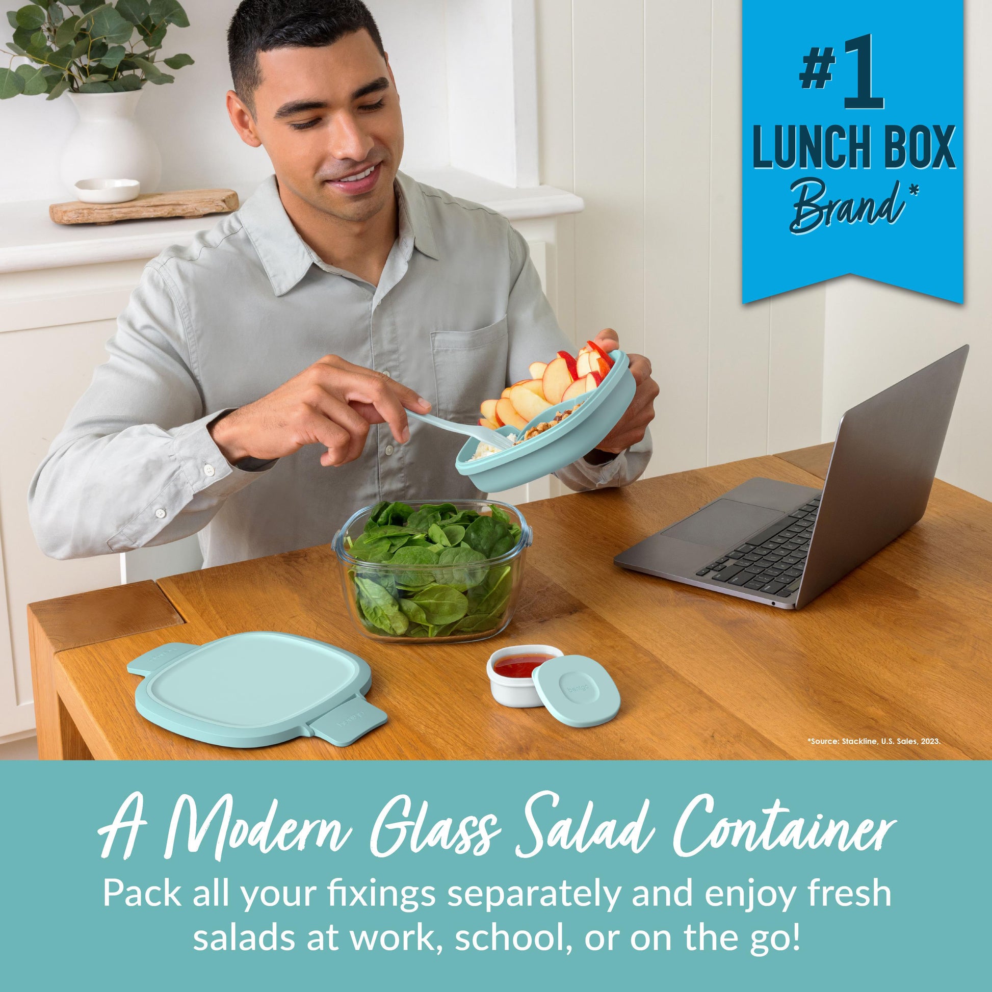 The Bentgo glass salad container makes it easy and convenient to eat healthy salads on the go. The all-in-one design offers the perfect solution for mess-free transport of your greens, salad toppings, and salad dressing so you can enjoy a delicious and nutritious salad just about anywhere. Ideal for pre-prepped meals to take to the office, school, or an outdoor picnic. Let your imagination run wild when you shake this spacious 7.6 cup glass bowl to mix your salad ingredients. The unique silicone seal around the lid and locking clips prevent leaking when you use it without the tray. Easily hold a hearty helping of greens, pasta, or fruit making it the perfect size for even the hungriest appetites. All the components of Bentgo Glass stack conveniently inside the large salad bowl for easy portability while a reusable fork stores under the lid for a complete all-in-one meal solution and helps cut down on the need for single-use plastics.