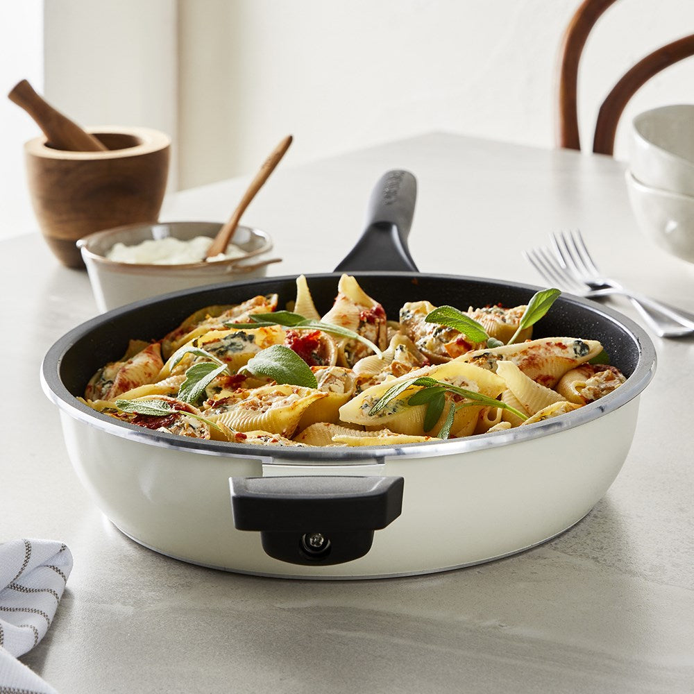 • Patented oven effect cooking allows you to cook cakes, pizza, and even a roast on your stovetop when you pair your frypan with a Bessemer® Universal Lid, all while still being oven safe to 180 degrees!