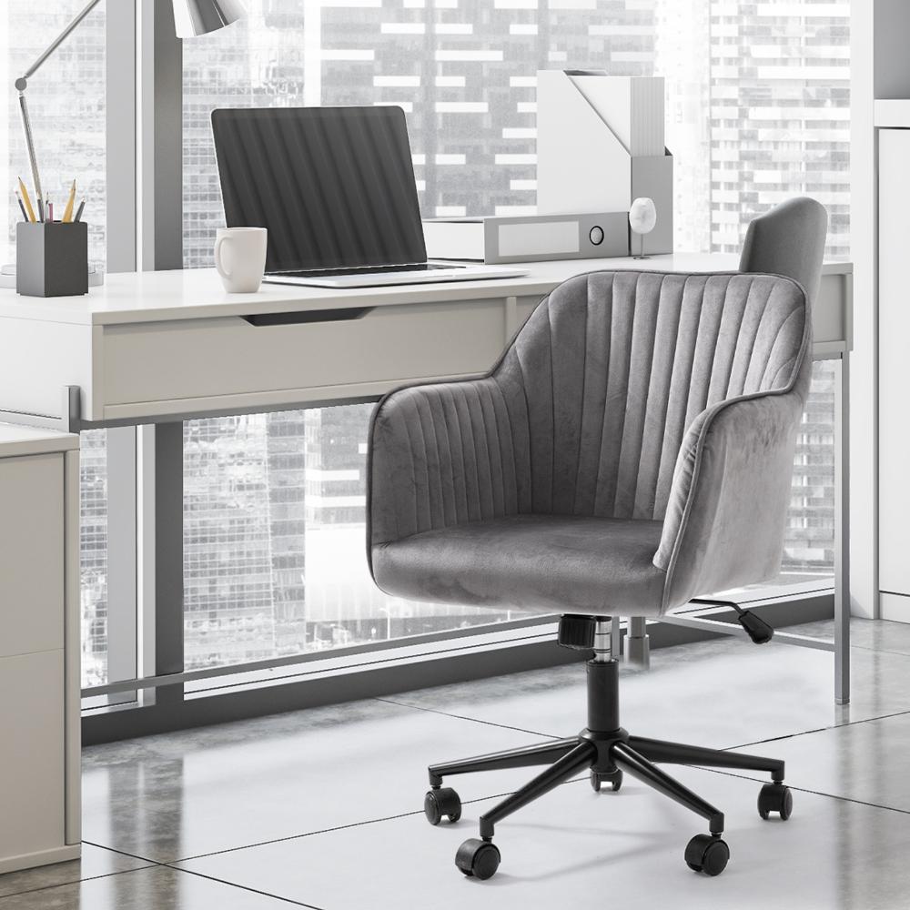 The Arles Office Chair is not only functional but matches comfort and style with its deep bucket seat and supportive armrests, swivel feature, wheel mobility, and panelled upholstery. The Arles is both stylish and practical, the ideal piece for your modern home office ensuring your productivity is on track while being picture perfect, too. Pneumatic height adjustment, and 360 degrees rotation so you can get into the perfect position. Easily slide around the office with built-in castor wheels on a 5-star swivel base providing for an ergonomic and supportive seating experience, in an upholstered fabric design and padded seating, you'll feel right at home, wherever you are. Featuring soft foam cushioning, and with a steel frame, this office chair is not only elegant and stylish, but comfy, strong, and supportive, as well. Perfect for studies, offices, board rooms and more, this lounge chair adds a sophisticated and modern vibe to any space!