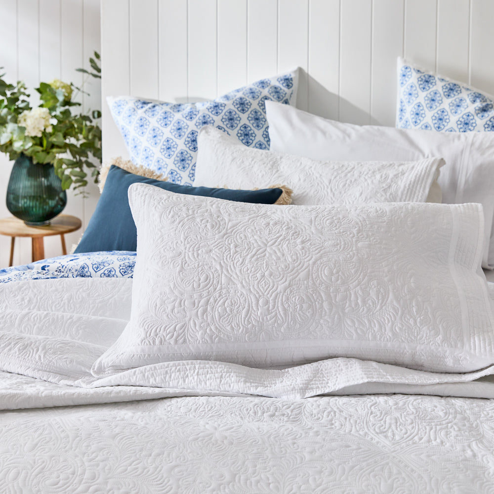 The Madison Coverlet Set comes with matching pillowcases, is a classic all seasons choice in fresh white or petrol blue, and showcases a delicate filigree stitched pattern with a generous border striped paneling, Layer it over any of the quilt covers for that extra layer to complete the look, or style it solo. The Madison Coverlet Set is perfect on its own on warm summer nights, or for adding an extra layer as the seasons get cooler.