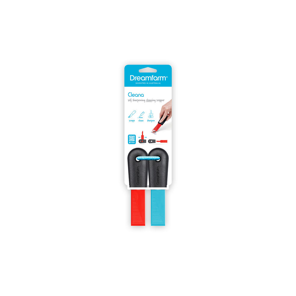 Cleana is a set of 2 non-stick safe cleaning tools with a built-in sharpener to create 1,000+ fresh scraping edges. Cleana’s non-scratch scraper safely removes stickers, labels, baked-on food, and hard to remove grime. Secondary hook scraper cleans hard-to-reach corners and crevices around stove tops and sink edges. Non-scratch scraper edge is as gentle on non-stick surfaces as a fingernail, but gets the job done without ruining your nails.