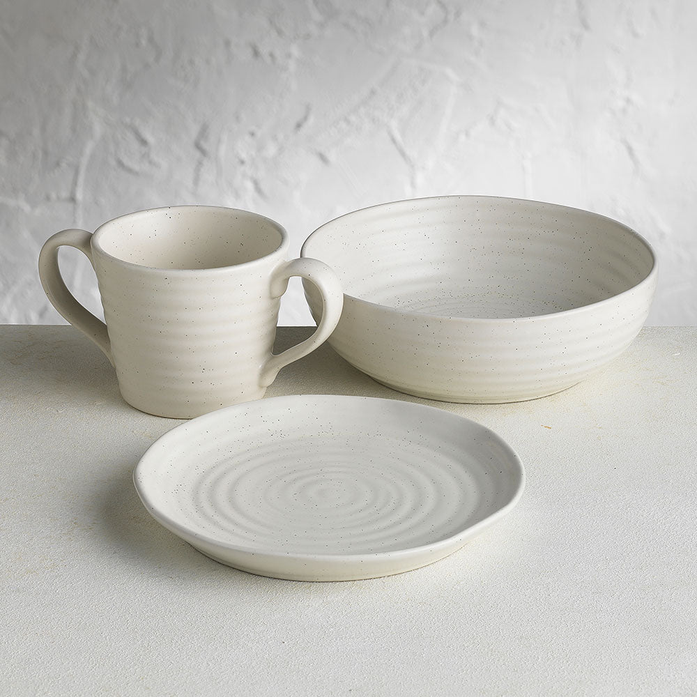 Designed to delight little ones, the Ecology Ottawa Kids 3 Piece Set Calico offers a miniature take on the stylish stoneware Ottawa collection. Perfect for small hands, this delightful set comprises of a coordinating plate, bowl and dual-handled mug that seamlessly caters for breakfast, lunch and dinner. Designed in Australia by homewares brand Ecology, the Ottawa Kids 3 Piece Set Calico boasts a gently ridged shape, featuring a soft speckle design and a dimpled, tactile finish. Packaged in a full-colour gift box, the Ecology Ottawa Kids 3 Piece Set Calico presents a wonderful, memorable gifting opportunity.