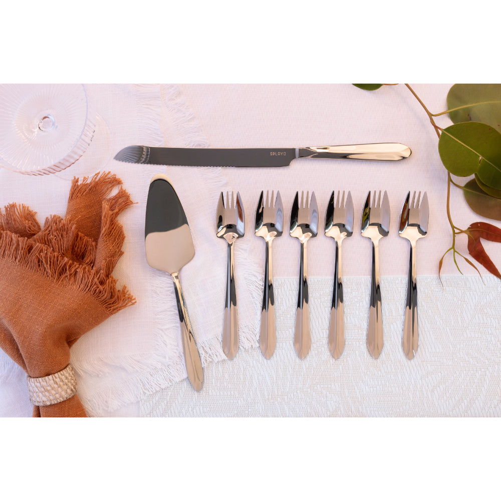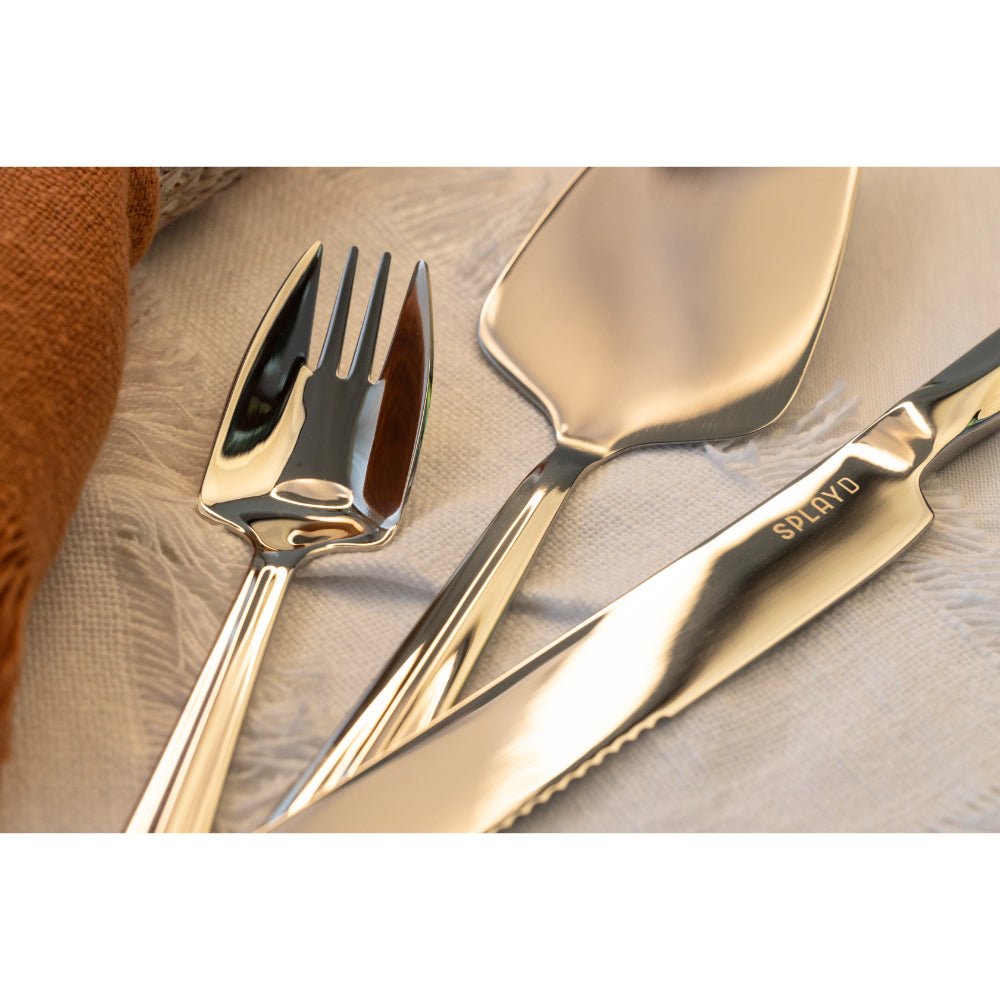 The Splayd Cake Knife & Server Set seamlessly blend timeless elegance with innovative functionality, featuring premium stainless-steel construction and a chic, mirror-polished finish. As an iconic Australian brand and invention from the late 1940s, Splayd is renowned for its all-in-one knife, fork, and spoon design, offering a refined and practical solution for serving and enjoying a variety of foods on any dining occasion.