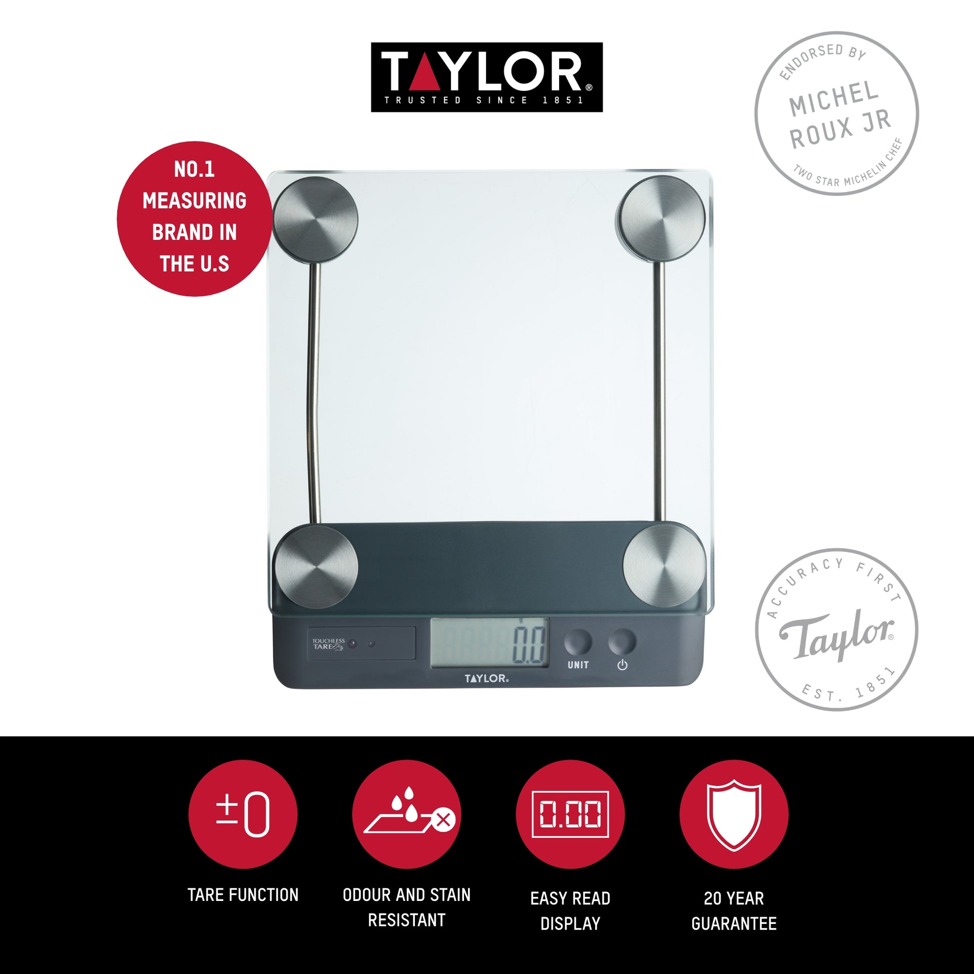 Forget about having to struggle with regular scales when you've got sticky, wet or flour-covered fingers. The Taylor Touchless Tare Digital Dual Kitchen Scale 14.4kg feature touchless tare technology - a simple wave of your hand sends the measurement back to zero. It's perfect for when you want to accurately measure powdered or liquid ingredients in bowls, or multiple different ingredients in the same bowl. Just wave your hand before adding each new ingredient. The tempered glass weighing platform measures 21 x 21 cm (8½ x 8½ inches), so it's nicely sized for measuring bowls. The digital scales are stain and odour resistant too, meaning you can weigh solid loose ingredients, like fruit, chocolate and cheese without the need for a bowl. Includes a 20-year guarantee.