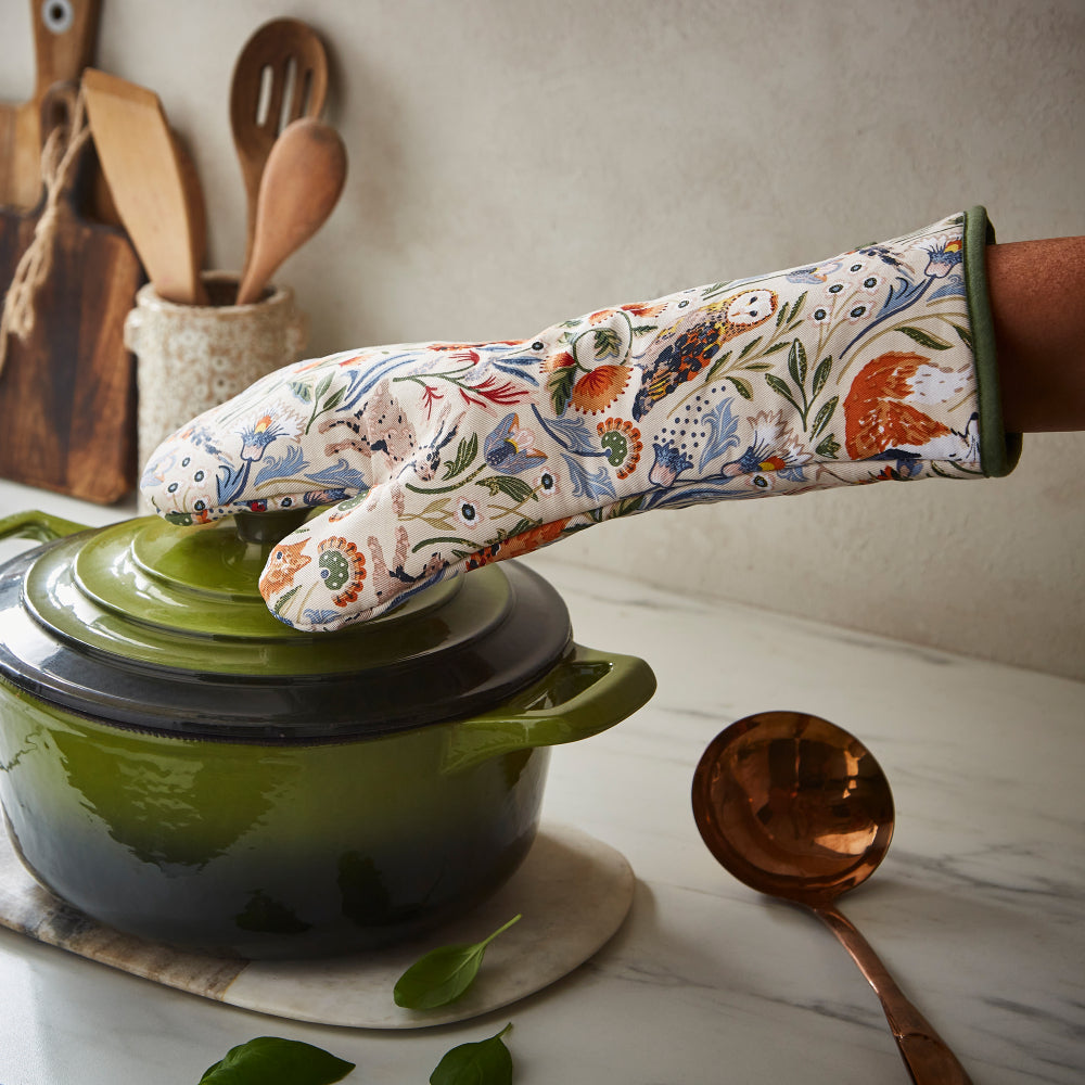 Ulster Weavers offers high-quality napery and kitchen textiles in a stunning array of designs sure to suit every taste. Our range of oven gloves are a fantastic way to add a pop of colour to any kitchen. This Blackthorn Oven Gauntlet adds elements of romance and beauty when entertaining friends and family for large dinners! It features an earthy atmospheric fantasy scene of woodland animals in the traditional Arts and Crafts style.